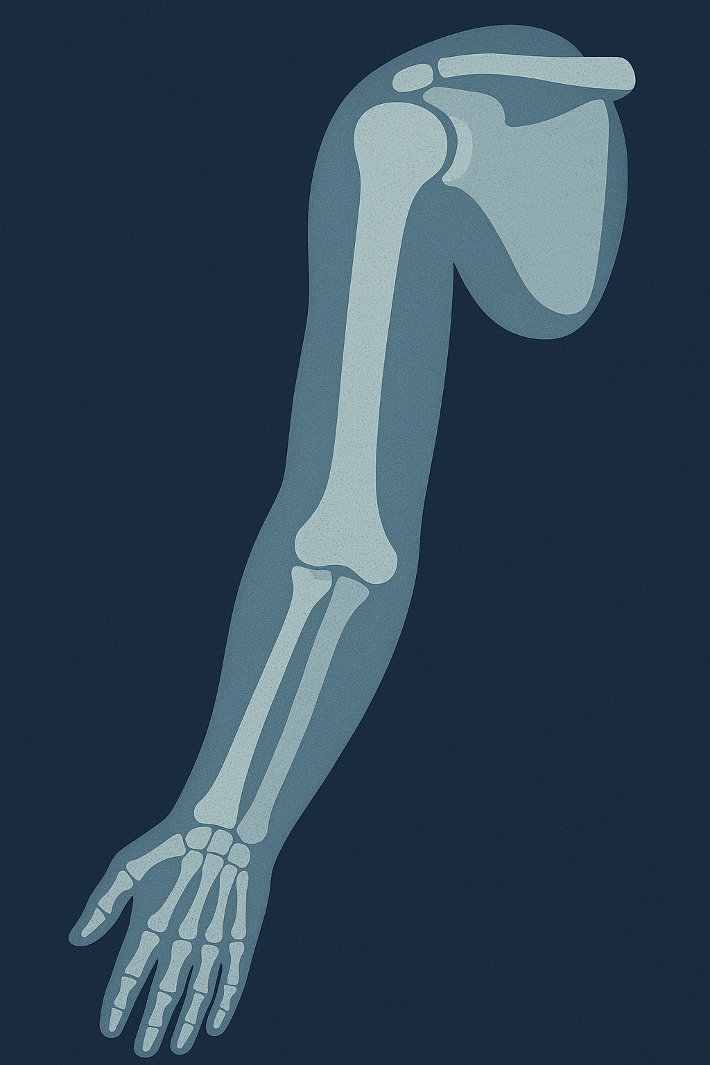 Mano, polso, avambraccio, gomito, omero e spalla.